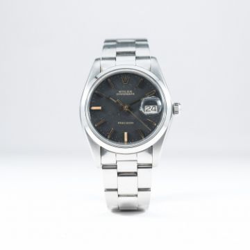 A GENTLEMAN'S STAINLESS STEEL ROLEX OYSTERDATE PRECISION BRACELET WATCH CIRCA 1974, REF. 6694 D: Matte black dial with gilt batons & hands, date aperture. M: 17 jewel manual wind movement, signed Montres Rolex S.A. & numbered. C: Oyster case, signed Montres Rolex S.A., numbered, Rolex crown, case diameter measures approx. 35mm. B: Rolex Oyster bracelet, numbered 78350/19/557. £1,000 £1,500 $1,477 $2,216 AED5,420 AED8,130 CONDITION REPORT D: Original dial in excellent condition. M: Working at present. C: In excellent condition. B: In excellent condition, with some light scratches due to general use. D: Dial / M: Movement / C: Case / S: Strap / B: Bracelet