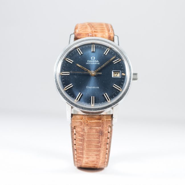 A GENTLEMAN'S STAINLESS STEEL OMEGA GENEVE AUTOMATIC WRIST WATCH CIRCA 1977, REF. 166.0202 D: Blue dial with black inlaid silver batons, date aperture. M: 23 jewel automatic movement signed Omega & numbered, calibre 1012. C: Circular screw back case, signed Omega Watch Co., Omega crown, case diameter measures approx 35mm. S: Leather strap. £250 £350 $369 $517 AED1,355 AED1,897 CONDITION REPORT D: Original dial in excellent condition. M: Working at present. C: In very good condition. S: In excellent condition. D: Dial / M: Movement / C: Case / S: Strap / B: Bracelet