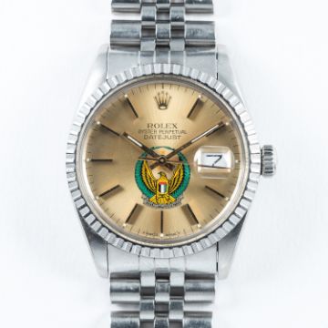 A RARE GENTLEMAN'S STAINLESS STEEL ROLEX OYSTER PERPETUAL DATEJUST BRACELET WATCH CIRCA 1984, REF. 16030 COMMISSIONED BY THE UAE ARMY D: Champagne dial with gilt batons & hands, UAE crest, date aperture. M: Automatic chronometer movement with quick set date, signed Montres Rolex S.A.. C: Oyster case with milled steel bezel, signed Montres Rolex S.A. & numbered, Rolex crown, case diameter measures approx. 36mm B: Original Rolex Jubilee bracelet, numbered 62510H/555. £2,500 £3,500 $3,693 $5,170 AED13,550 AED18,970 CONDITION REPORT D: Original dial in excellent condition. M: Working at present. C: In excellent condition, with some light scratches due to general use. B: In very good condition. D: Dial / M: Movement / C: Case / S: Strap / B: Bracelet