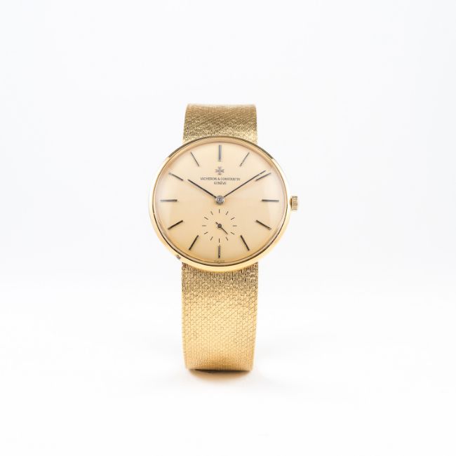 A GENTLEMAN'S 18K SOLID GOLD VACHERON & CONSTANTIN BRACELET WATCH CIRCA 1970s, REF. 6319 D: Champagne dial with black inlaid gilt batons & hands, subsidiary seconds. M: 18 jewel manual wind movement signed Vacheron & Constantin, numbered, calibre 1001/2. C: Circular case signed Vacheron & Constantin, hallmarked & numbered, original crown, case diameter measures approx. 34mm. B: Original Vacheron & Constantin 18k gold integral bracelet, total length measures approx. 190mm. £2,500 £3,500 $3,693 $5,170 AED13,550 AED18,970 CONDITION REPORT D: Dial in excellent condition. M: Working at present. C: In excellent condition. B: In excellent condition. D: Dial / M: Movement / C: Case / S: Strap / B: Bracelet