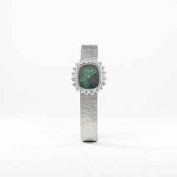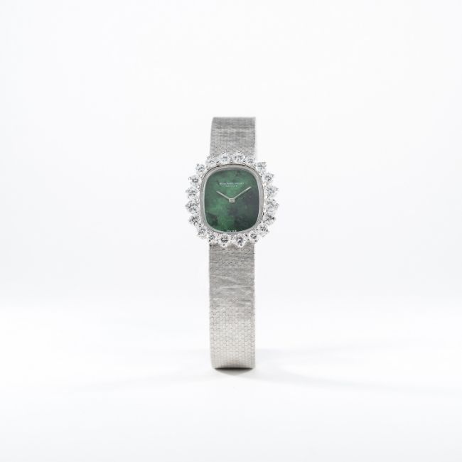 A FINE & RARE LADIES 18K SOLID WHITE GOLD & DIAMOND AUDEMARS PIGUET BRACELET WATCH CIRCA 1970s D: Green malachite dial. M: 20 jewel manual wind movement signed Audemars Piguet. C: Case with original brilliant cut diamond surround, signed Audemars Piguet, 18k hallmarks, numbered, case measures approx. 23mm by 21mm. B: Original 18k solid white gold AP bracelet, total length measures approx. 170mm. £4,000 £6,000 $5,908 $8,862 AED21,680 AED32,520 CONDITION REPORT D: Original dial in excellent condition. M: Working at present. C: In excellent condition. B: In excellent condition. D: Dial / M: Movement / C: Case / S: Strap / B: Bracelet