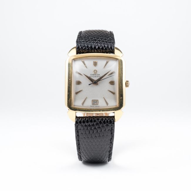 A GENTLEMAN'S 18K SOLID GOLD OMEGA AUTOMATIC CALENDAR WRIST WATCH CIRCA 1954, REF. 3953 SC D: Silver dial with gilt "dagger" batons & dauphine hands, date aperture. M: 17 jewel automatic movement signed Omega Watch Co. & numbered, calibre 353. C: Cushion shaped case, signed Omega, 18k hallmarks, case width measures approx. 35mm. S: Leather strap with Omega pin buckle. £1,500 £2,000 $2,216 $2,954 AED8,130 AED10,840 CONDITION REPORT D: Dial in excellent condition. M: Working at present. C: In excellent condition, with some light scratches due to general use. S: In excellent condition. D: Dial / M: Movement / C: Case / S: Strap / B: Bracelet