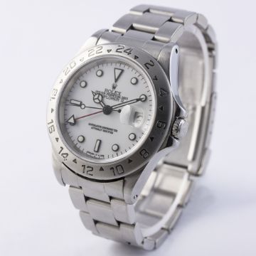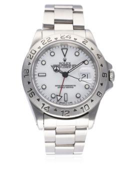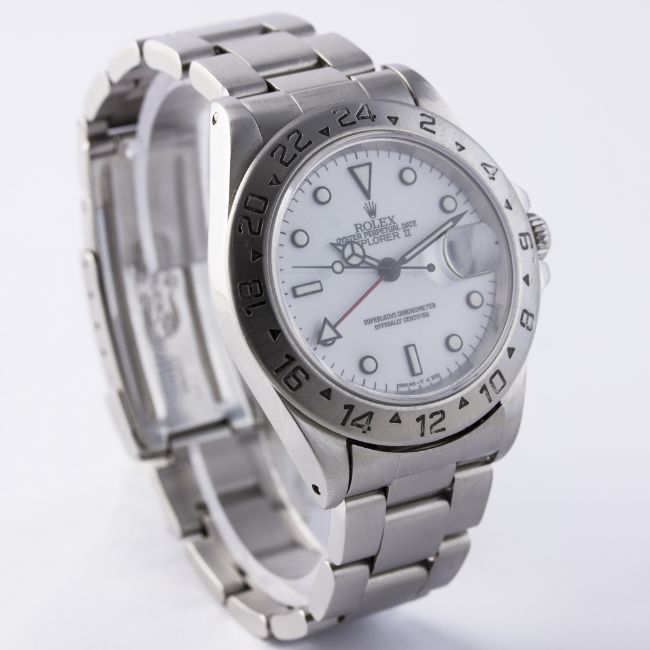 D: White dial with luminous inlaid black markers & Mercedes hands, dual time zone arrow hand, date aperture. M: 31 jewel automatic chronometer movement signed Montres Rolex S.A, calibre 3185. C: Oyster case with fixed 24 hour bezel & sapphire crystal, signed Montres Rolex S.A., U serial no., Rolex crown, case diameter measures approx 39mm. B: Rolex Oyster bracelet with flip lock clasp, numbered U2/78790/501B.