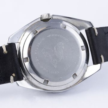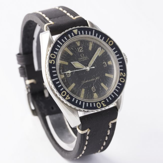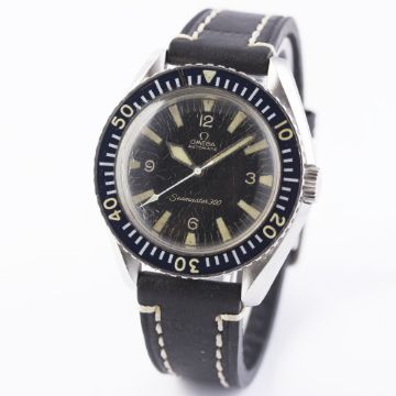 D: Black dial with quarterly Arabic numerals, luminous hour markers & "sword" hands. M: 24 jewel automatic movement, signed Omega Watch Co. & numbered, calibre 552. C: Circular case with blue 60 minute rotating bezel, signed Omega Watch Co., Seamaster emblem on case back, Omega crown, case diameter measures approx. 42mm. S: Leather strap.