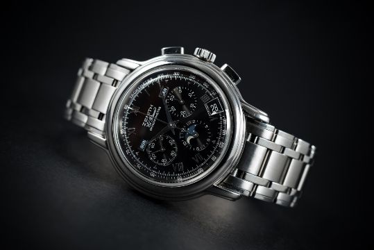 D: Black dial with silver Roman numerals, triple register with recording hours, minutes & continuous seconds, day, date & month apertures, moonphase display, outer tachymetre scale. M: 31 jewel automatic movement, El Primero calibre 410. C: Circular case with stepped bezel & lugs, exhibition back, signed Zenith Chronomaster, original crown & pushers, case diameter measures approx. 40mm. B: Original Zenith stainless steel bracelet.