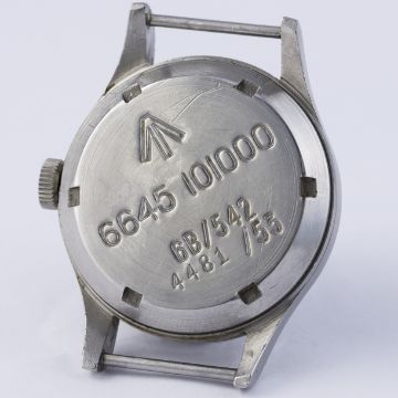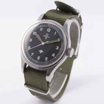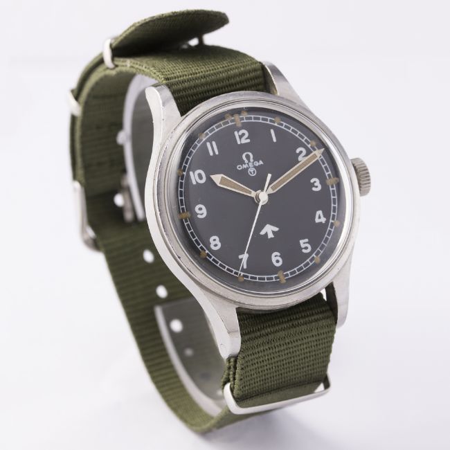 D: Black dial with Arabic numerals & military arrow, tritium luminous markers. M: 17 jewel manual wind movement signed Omega & numbered, calibre 283. C: Military case with fixed bars, issue markings ^ 6645 101000 6B/542 4481/53, signed Omega Watch Co, dust cover & inner ring, case diameter measures approx. 37mm. S: NATO strap.