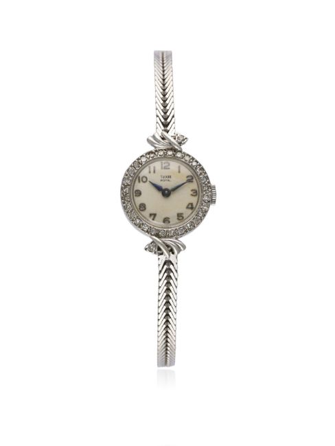D: Silver dial with raised Arabic numerals. M: 17 jewel manual wind movement, signed Tudor. C: Original diamond set circular case, signed DS&S, hallmarked & numbered, Rolex crown, case diameter measures approx 18mm. B: Original Rolex 9ct solid white gold bracelet.