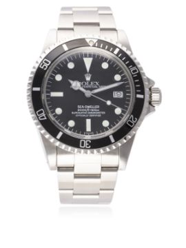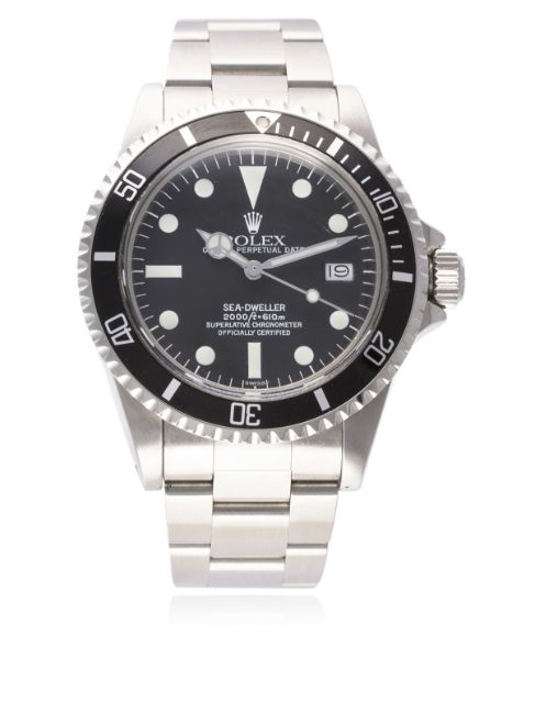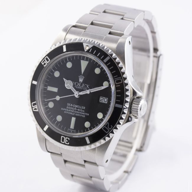 A GENTLEMAN'S STAINLESS STEEL ROLEX OYSTER PERPETUAL DATE SEA DWELLER BRACELET WATCH CIRCA 1978, REF. 1665 WITH SERVICE DIAL D: Black dial with luminous markers, Mercedes hands, date aperture. M: 26 jewel automatic chronometer movement, signed Rolex & numbered, calibre 1570. C: Oyster case with 60 minute rotating bezel, gas escape valve, signed Montres Rolex S.A., numbered, Rolex triplock crown, case diameter measures approx. 40mm. B: Rolex Oyster bracelet with flip lock clasp, numbered LT12/93150/585.