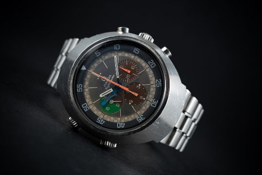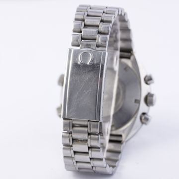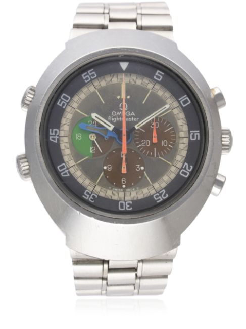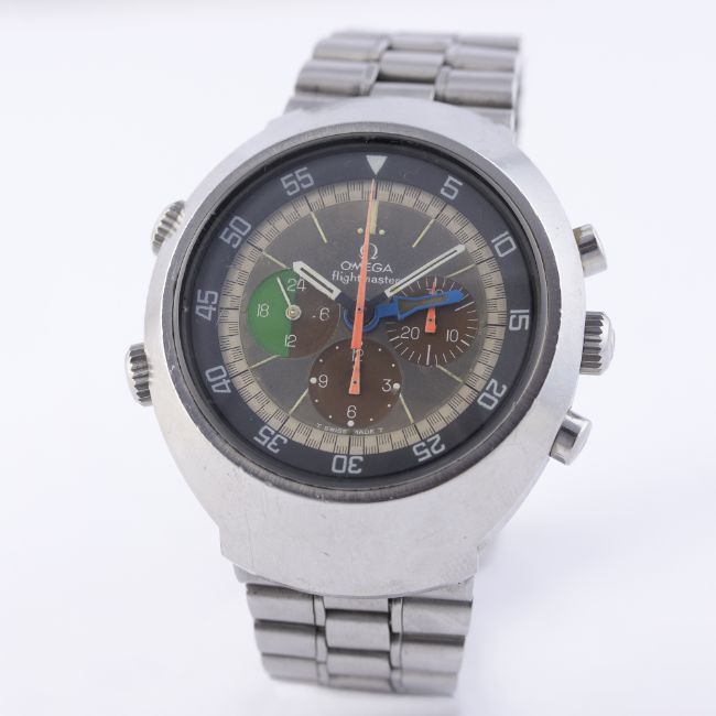 D: “Tropical” dial with luminous markers, triple register recording hours & minutes with 24 hour display, orange chronograph hands, blue GMT jet hand, inner rotating bezel. M: 17 jewel manual wind movement, signed Omega & numbered, calibre 910. C: Large tonneau shaped case, signed Omega Watch Co., Flightmaster logo on case back, Omega crowns & pushers, case width measures approx 43mm. B: Omega bracelet, numbered (11) 1159/155.