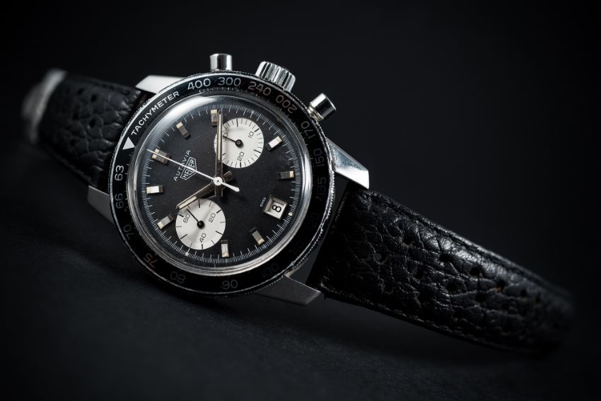 A RARE GENTLEMAN'S STAINLESS STEEL HEUER AUTAVIA DATO CHRONOGRAPH WRIST WATCH CIRCA 1970, REF. 7863C D: Black dial with part luminous silver batons & hands, two silver registers recording minutes & continuous seconds, date aperture at 6 o'clock. M: 17 jewel manual wind movement signed Heuer Leonidas SA, Valjoux calibre 7734. C: Circular case with rotating tachymeter bezel, signed Heuer-Leonidas SA, numbered, Heuer crown & pushers, case diameter measures approx. 40mm. S: Black perforated leather strap with Heuer pin buckle.