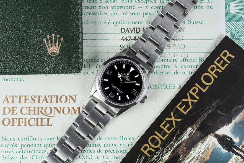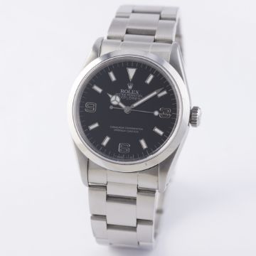 A RARE GENTLEMAN'S STAINLESS STEEL ROLEX OYSTER PERPETUAL EXPLORER "BLACK OUT" BRACELET WATCH DATED 1993, REF. 14270 WITH ORIGINAL PAPERWORK, BOOKLETS & ROLEX SERVICE GUARANTEE FROM 2005, 2011 & 2015 D: Gloss black dial with luminous inlaid silver markers & black inlaid 3-6-9 Arabic numerals, silver font & tracking, Mercedes hands. M: Automatic chronometer movement, signed Rolex & numbered. C: Oyster case with sapphire crystal, signed Montres Rolex S.A., X serial no., Rolex crown, case diameter measures approx. 36mm. B: Original Rolex Oyster bracelet, numbered S3/78360/558 B.