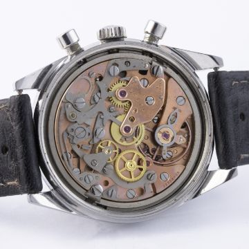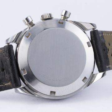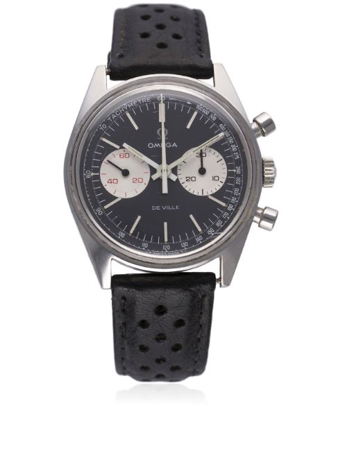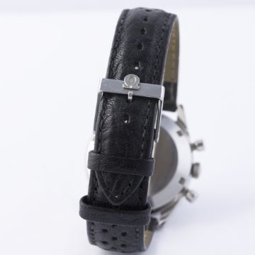D: Brushed charcoal dial with silver batons, two silver registers recording minutes & continuous seconds, outer tachymetre scale. M: 17 jewel manual wind movement signed Omega Watch Co. & numbered, calibre 860. C: Circular screw back case, signed Omega Watch Co., Omega crown, case diameter measures approx. 35mm. S: Black leather racing strap with Omega pin buckle.