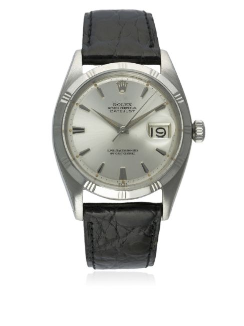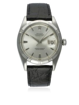 D: Silver dial with silver "coffin" shaped markers & dauphine hands, date aperture. M: 25 jewel automatic chronometer movement with "butterfly" rotor, signed Montres Rolex S.A. & numbered, calibre 1560. C: Oyster case with faceted steel bezel, signed Montres Rolex S.A., dated IV.60, numbered, Rolex crown, case diameter measures approx. 36mm. S: Leather strap.