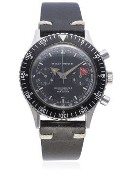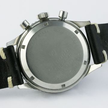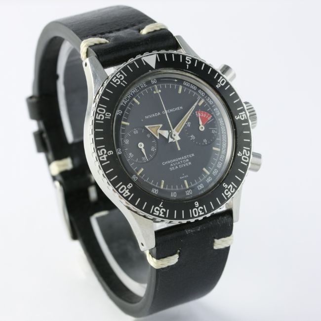D: Black dial with luminous markers & broad "arrow" hand, double register recording minutes & continuous seconds, outer tachymeter scale. M: 17 jewel manual wind movement signed Nivada, Valjoux calibre 92. C: Circular screw back case with 60 minute rotating bezel, signed Nivada Watch Co. & numbered, Nivada crown & pushers, case width measures approx. 38mm. S: Black leather strap.