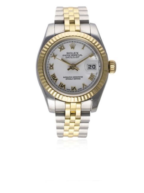 D: White dial with gold Roman numerals, date aperture. M: Automatic chronometer movement with quick-set date, signed Rolex & numbered. C: Oyster case with solid gold fluted bezel, sapphire crystal, signed Montres Rolex S.A., Rolex crown, case diameter measures approx. 27mm. B: Original Rolex Jubilee steel & solid gold bracelet, numbered CL7/63133.