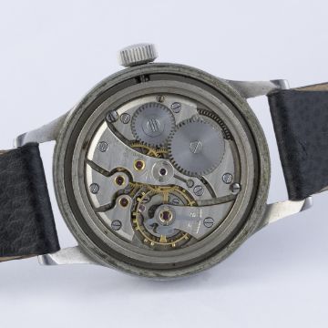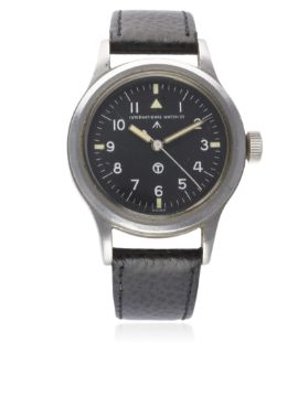 D: Black dial with Arabic numerals & tritium luminous markers, military arrow. M: Manual wind movement signed International Watch Co. with military arrow & numbered, calibre 89 with "hacking" seconds. C: Military case with fixed bars, issue markings ^ 6B/346 310/50, dust cover, case diameter measures approx. 36mm. S: Black leather strap.