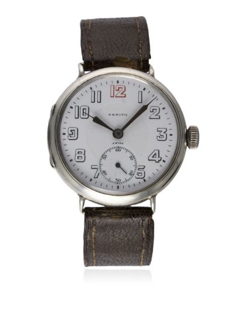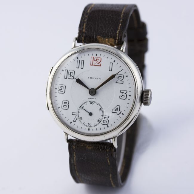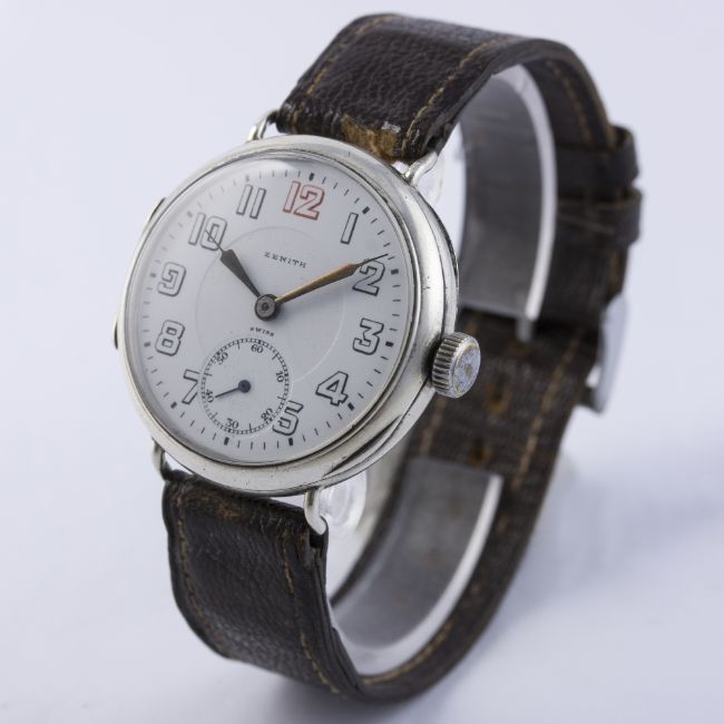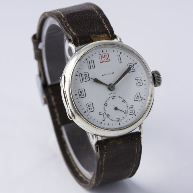 D: White enamel dial with Arabic numerals, subsidiary seconds. M: 15 jewel manual wind movement with swan neck regulator, signed Zenith Watch Co. & numbered. C: Circular "trench" style hinged case, signed Zenith Watch Co., hallmarked & numbered, case diameter measures approx. 35mm. S: Leather strap.