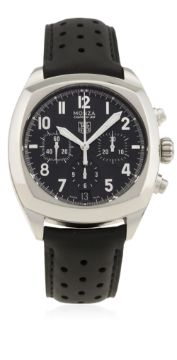 A GENTLEMAN'S STAINLESS STEEL TAG HEUER MONZA CALIBRE 36 CHRONOGRAPH WRIST WATCH CIRCA 2005, REF. CR5110 WITH BOX & OPEN PAPERS  D: Black guilloche dial with silver Arabic numerals & luminous hands, triple register recording hours, minutes & continuous seconds, date aperture. M: Automatic "El Primero" movement signed TAG Heuer & numbered, calibre 36. C: Cushion shaped case with exhibition back, numbered, original crown & pushers, case width measures approx. 38mm. S: TAG Heuer perforated leather strap & deployment clasp.CONDITION REPORT D: Original dial in excellent condition. M: Working at present. C: In excellent condition. S: In excellent condition. D: Dial / M: Movement / C: Case / S: Strap / B: Bracelet