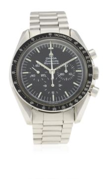 A GENTLEMAN'S STAINLESS STEEL OMEGA SPEEDMASTER PROFESSIONAL CHRONOGRAPH BRACELET WATCH CIRCA 1976, REF. 145.022-76 ST WITH OMEGA BOX D: Black dial with luminous markers, triple register recording hours, minutes & continuous seconds. M: 17 jewel manual wind movement, signed Omega & numbered, calibre 861. C: Circular case with tachymetre bezel, signed Omega Watch Co., Speedmaster emblem embossed on case back with NASA moon landing tribute, dust cover, Omega crown & pushers, case diameter measures approx. 42mm. B: Omega Speedmaster bracelet, numbered (11) 1171/633.CONDITION REPORT D: Original dial in excellent condition. M: Working at present. C: In excellent condition, with some small scratches due to general use. B: In excellent condition, with some light scratches due to general use. D: Dial / M: Movement / C: Case / S: Strap / B: Bracelet