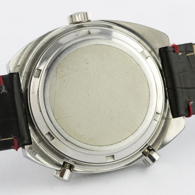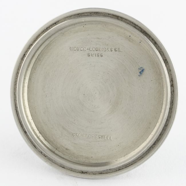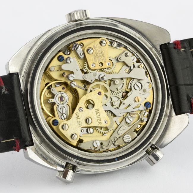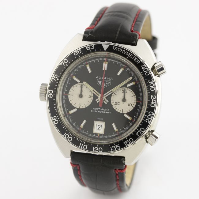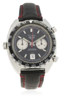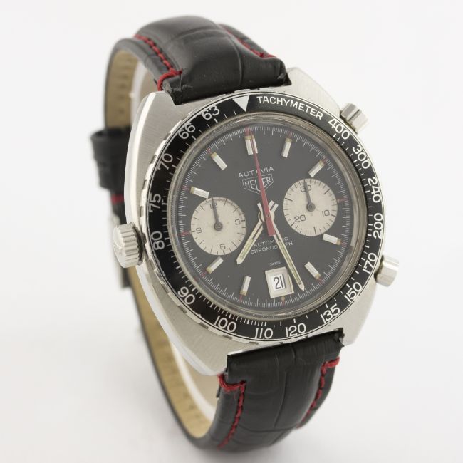 A GENTLEMAN'S STAINLESS STEEL HEUER AUTAVIA CHRONOGRAPH WRIST WATCH CIRCA 1970s, REF. 1163 D: Black dial with part luminous silver batons & hands, two silver registers recording hours & minutes, date aperture at 6 o'clock, red centre chronograph hand. M: 17 jewel automatic movement signed Heuer, calibre 12. C: Tonneau shaped case with rotating tachymeter bezel, signed Heuer-Leonidas S.A., numbered, Heuer crown & pushers, case width measures approx. 42mm. S: Black leather strap with red stitching.CONDITION REPORT D: Original dial in excellent condition, silver registers showing some signs of age. M: Working at present. C: In excellent condition, with some light scratches due to general use. S: New. D: Dial / M: Movement / C: Case / S: Strap / B: Bracelet
