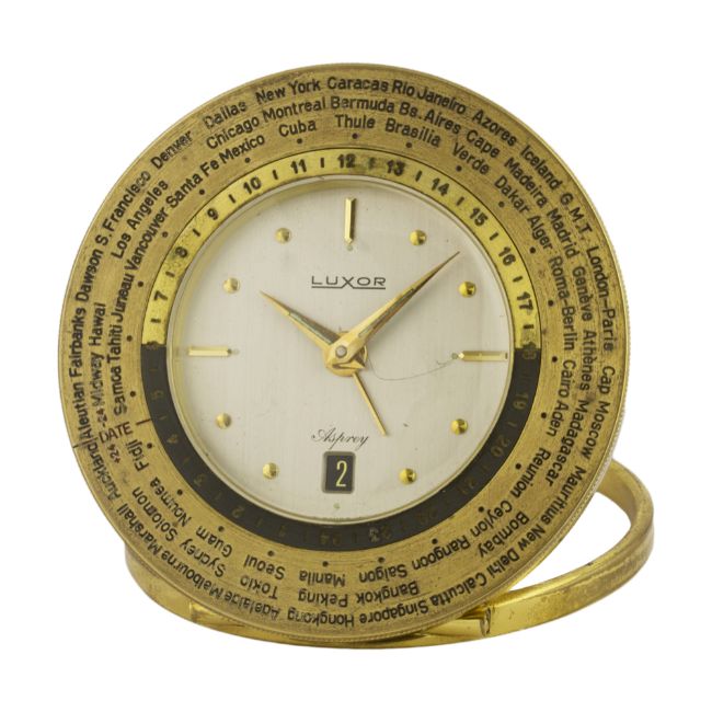 AN 8 DAY LUXOR WORLD TIME ALARM DESK CLOCK CIRCA 1960s, REF. 1005 RETAILED BY ASPREY D: Silver dial with gilt batons & markers, date aperture. M: Manual wind 8 day movement. C: Circular gilt case with rotating bezel, case diameter measures approx. 76mm.CONDITION REPORT D: Original dial in excellent condition. M: Working at present. C: In very good condition. D: Dial / M: Movement / C: Case / S: Strap / B: Bracelet