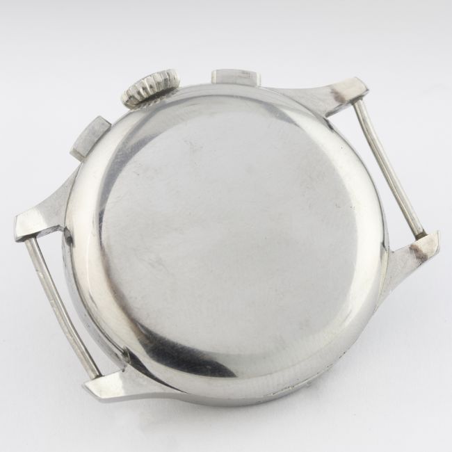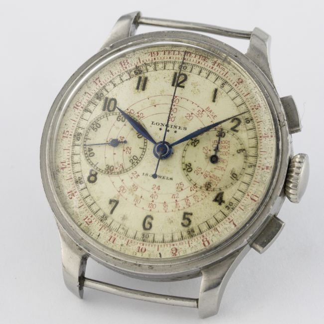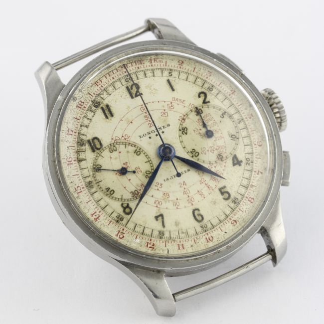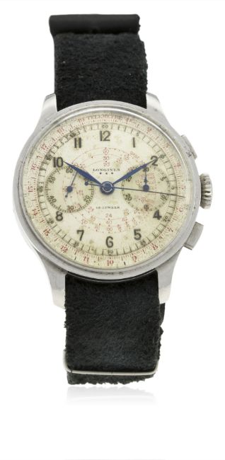 A RARE GENTLEMAN'S LARGE SIZE STAINLESS STEEL LONGINES 13ZN FLY BACK CHRONOGRAPH WRIST WATCH CIRCA 1936 D: Silver dial with black Arabic numerals, double register recording minutes & continuous seconds, outer telemetre & inner tachymetre scales, blue steel hands. M: 18 jewel manual wind movement signed Longines & numbered, calibre 13ZN. C: Circular snap back case with fixed bars, numbered (matching movement number), case diameter measures approx. 37mm. S: Leather NATO strap.CONDITION REPORT D: Original dial in very good condition, showing some signs of age. M: Working at present. C: In excellent condition, with some light scratches due to general use. S: In very good condition. D: Dial / M: Movement / C: Case / S: Strap / B: Bracelet