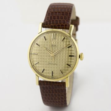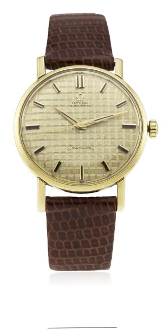 A RARE GENTLEMAN'S 18K SOLID GOLD OMEGA SEAMASTER AUTOMATIC WRIST WATCH CIRCA 1960s D: Gold "chequerboard" dial with Onyx inlaid gold batons & dauphine hands. M: Automatic movement, signed Omega Watch Co. & numbered. C: Circular case, signed Omega Watch Co., hallmarked & numbered, Seamaster emblem embossed onto case back, Omega crown, case diameter measures approx. 34mm. S: Brown leather strap.CONDITION REPORT D: Original dial in excellent condition. M: Working at present. C: In excellent condition, with some light scratches due to general use. S: New. D: Dial / M: Movement / C: Case / S: Strap / B: Bracelet