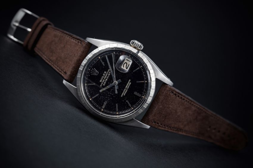 A RARE GENTLEMAN'S STAINLESS STEEL ROLEX OYSTER PERPETUAL DATEJUST WRIST WATCH CIRCA 1957, REF. 6605 D: Gloss black dial with silver batons, silver font & tracking, "roulette" date. M: 25 jewel automatic chronometer movement with "butterfly" rotor, signed Montres Rolex S.A. & numbered, calibre 1065. C: Oyster case with faceted steel bezel, signed Montres Rolex S.A., dated IV.57, numbered, Rolex crown, case diameter measures approx. 36mm. S: Brown leather strap.CONDITION REPORT D: Original dial in very good condition showing signs of age. M: Working at present. C: In very good condition. S: New. D: Dial / M: Movement / C: Case / S: Strap / B: Bracelet