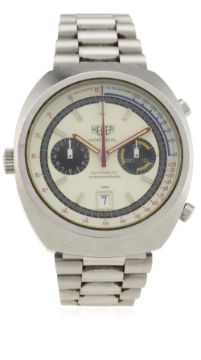 D: White dial with luminous inlaid silver batons & red hands, two grey registers recording hours & minutes, date aperture at 6 o'clock, inner bezel with tachymetre & pulsations scales. M: 17 jewel automatic movement signed Heuer, calibre 12. C: Tonneau shaped case, signed Heuer-Leonidas SA, Heuer crown & pushers, mineral glass, case width measures approx. 43mm. B: Stainless steel TAG Heuer bracelet with flip lock clasp.