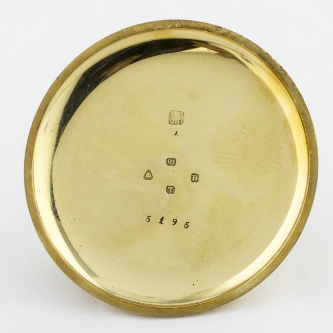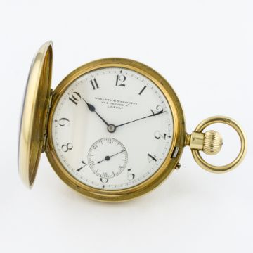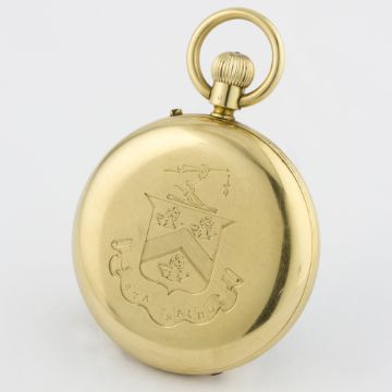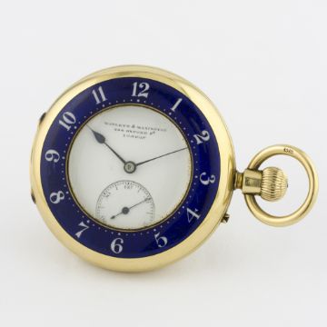 A GENTLEMAN'S 18K SOLID GOLD ENGLISH HALF HUNTER POCKET WATCH BY WAYLETT & MANNINGTON, LONDON CIRCA 1890 D: White enamel dial with Arabic numerals, subsidiary seconds. M: Keyless wind movement signed Waylett & Mannington, 234 Oxford Street, London, numbered. C: Circular hinged case, blue enamel bezel with Arabic numerals, 18k London hallmarks, coat of arms engraved onto case back, numbered, case diameter measures approx. 48mm excluding the neck & bow.CONDITION REPORT D: Original dial in excellent condition. M: Working at present. C: In excellent condition, a small scratch on the enamel at 2 o'clock.. S: In excellent condition. D: Dial / M: Movement / C: Case / S: Strap / B: Bracelet