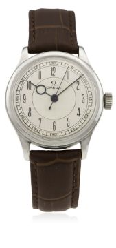 A GENTLEMAN'S STAINLESS STEEL OMEGA WRIST WATCH CIRCA 1939, REF. 10033272 D: Two tone silver dial with Art Deco numerals & hands. M: 16 jewel manual wind movement signed Omega & numbered, calibre 30SCT2. C: Circular screw back "waterproof" case, signed Omega & numbered, numbered on lug, Omega crown, case diameter measures approx. 35mm. S: Brown leather strap with Omega pin buckle.CONDITION REPORT D: Dial in excellent condition. M: Working at present. C: In excellent condition, with some light surface scratches due to general use. S: New. D: Dial / M: Movement / C: Case / S: Strap / B: Bracelet