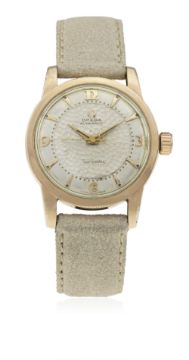 A RARE GENTLEMAN'S PINK GOLD CAPPED OMEGA SEAMASTER AUTOMATIC WRIST WATCH CIRCA 1952, REF. 2577-23 SC WITH "GOLF BALL" DIAL D: Two tone silver dial with embossed centre, pink gold Art Deco numerals & "dagger" batons, dauphine hands. M: 17 jewel "bumper" automatic movement signed Omega Watch Co & numbered, calibre 354. C: Circular screw back case, signed Omega Watch Co., Omega crown, case diameter measures approx. 34mm. S: Leather strap.CONDITION REPORT D: Original dial in very good condition, showing some small signs of age. M: Working at present. C: In excellent condition, with some small scratches due to general use. S: In excellent condition. D: Dial / M: Movement / C: Case / S: Strap / B: Bracelet