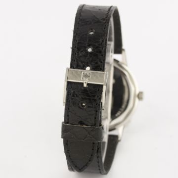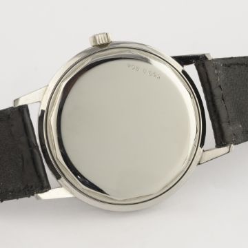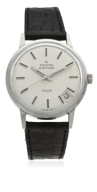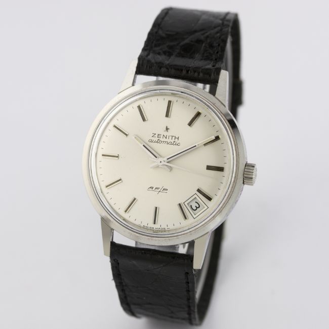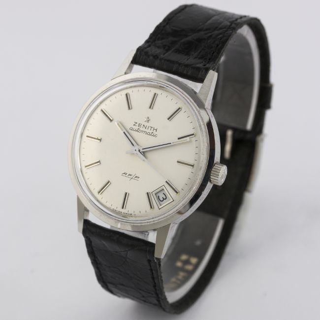 A GENTLEMAN'S "NOS" STAINLESS STEEL ZENITH AF/P HIGH FREQUENCY PRECISION AUTOMATIC WRIST WATCH CIRCA 1970s D: Silver dial with black inlaid silver batons, date aperture. M: 28 jewel automatic movement signed Zenith, calibre 408. C: Circular screw back case, signed Zenith & numbered, original crown, case diameter measures approx. 34mm. S: Original Zenith black leather strap & pin buckle.CONDITION REPORT D: Original dial in excellent condition. M: Working at present. C: In excellent condition. S: In excellent condition. The watch looks to be in "NOS" condition. D: Dial / M: Movement / C: Case / S: Strap / B: Bracelet