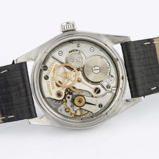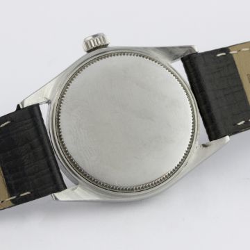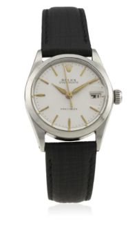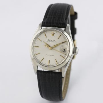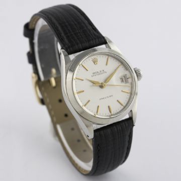 A MID SIZE STAINLESS STEEL ROLEX OYSTERDATE PRECISION WRIST WATCH CIRCA 1965, REF. 6466 D: Silver dial with gilt batons & "dagger" hands, date aperture. M: 17 jewel manual wind movement, signed Montres Rolex & numbered, calibre 1215. C: Oyster case, signed Montres Rolex S.A., dated I.65 & numbered, Rolex crown, case diameter measures approx. 31mm. S: Black leather strap.CONDITION REPORT D: Original dial in excellent condition. M: Working at present. C: In very good condition, with some small scratches due to general use. S: New. D: Dial / M: Movement / C: Case / S: Strap / B: Bracelet
