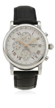 D: Two tone silver dial with rose gold Roman numerals & hands, triple register recording hours, minutes & continuous seconds, date aperture, GMT hand with inner 24 hour bezel for second time zone. M: 25 jewel automatic movement signed Montblanc Meisterstuck & numbered. C: Circular case with exhibition back, signed Montblanc Meisterstuck & numbered, original crown & pushers, case diameter measures approx. 42mm. S: Original Montblanc leather strap & deployment clasp.