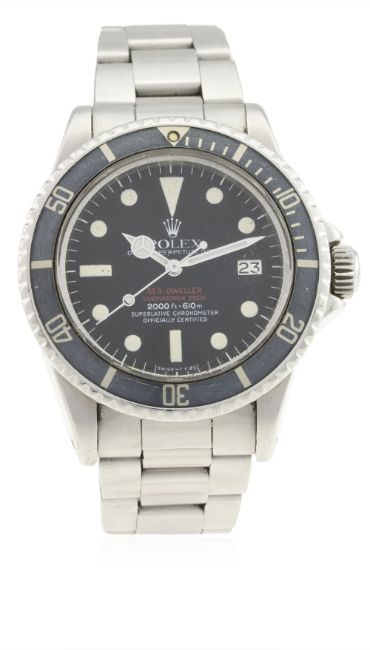A VERY RARE GENTLEMAN’S STAINLESS STEEL ROLEX OYSTER PERPETUAL DATE “DOUBLE RED” SEA DWELLER BRACELET WATCH CIRCA 1975, REF. 1665 WITH ROLEX SERVICE  RECEIPT FROM 1996 D: Matt black dial with luminous markers & Mercedes hands, date aperture. M: 26 jewel automatic chronometer movement, signed Montres Rolex S.A. & numbered, calibre 1570. C: Oyster case with 60 minute rotating bezel, gas escape valve, signed Montres Rolex S.A., serial number matching in between lugs and inside case back, Rolex triplock crown, case diameter measures approx. 40mm. B: Rolex Oyster bracelet with flip lock clasp, numbered OP3/93150/585.CONDITION REPORT D: Original dial in excellent condition. M: Working at present. C: In excellent condition with some small scratches & light wear due to general use, bezel insert nicely faded. B: In very good condition with some scratches wear due to general use D: Dial / M: Movement / C: Case / S: Strap / B: Bracelet