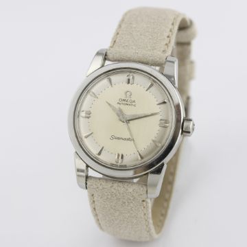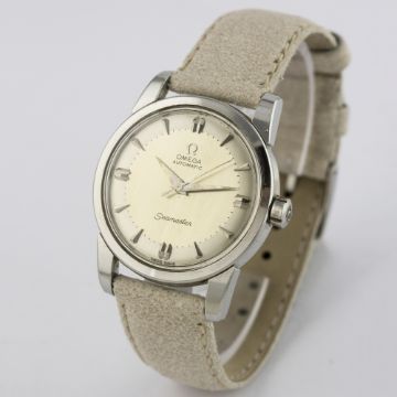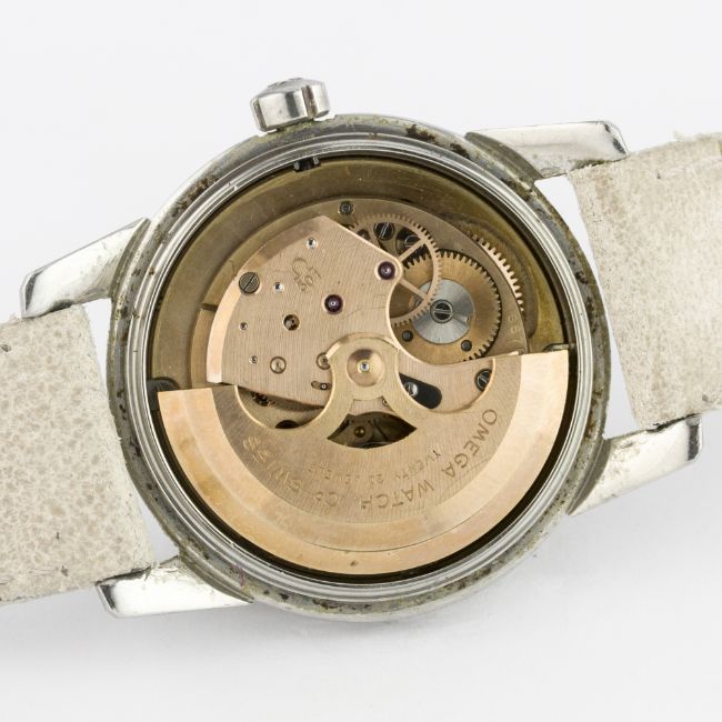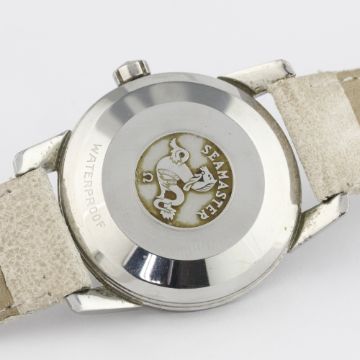 A GENTLEMAN'S STAINLESS STEEL OMEGA SEAMASTER AUTOMATIC WRIST WATCH CIRCA 1958, REF. 2846 15 SC D: Two tone silver dial with faceted silver batons & dauphine hands, inner minute track. M: 20 jewel automatic movement, signed Omega Watch Co. & numbered, calibre 501. C: Circular snap back 'waterproof' case, signed Omega Watch Co., Seamaster emblem embossed onto case back, Omega crown, case diameter measures approx. 34mm. S: Leather strap.CONDITION REPORT D: Original dial in excellent condition. M: Working at present. C: In excellent condition with some light scratches due to general use. S: In excellent condition. D: Dial / M: Movement / C: Case / S: Strap / B: Bracelet