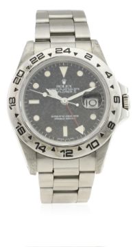 A GENTLEMAN'S STAINLESS STEEL ROLEX OYSTER PERPETUAL DATE EXPLORER II BRACELET WATCH CIRCA 1987, REF. 16550 WITH ORIGINAL PAPERS D: Black "rail" dial with luminous inlaid white gold markers & Mercedes hands, dual time zone arrow hand, date aperture. M: 27 jewel automatic chronometer movement, signed Rolex & numbered, calibre 3085. C: Oyster case with 24 hour bezel, signed Montres Rolex S.A., numbered, R serial no., Rolex crown, case diameter measures approx. 40mm. B: Rolex Oyster bracelet, numbered L4/78360/501.CONDITION REPORT D: Original dial in good condition, showing signs of age that would appeal to some. M: Working at present. C: In very good condition, with some light scratches due to general use. B: In very good condition. D: Dial / M: Movement / C: Case / S: Strap / B: Bracelet
