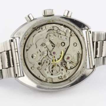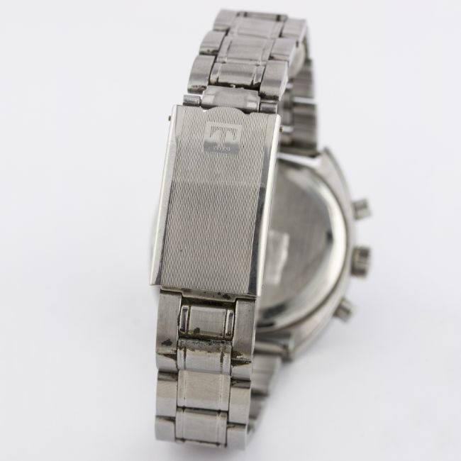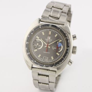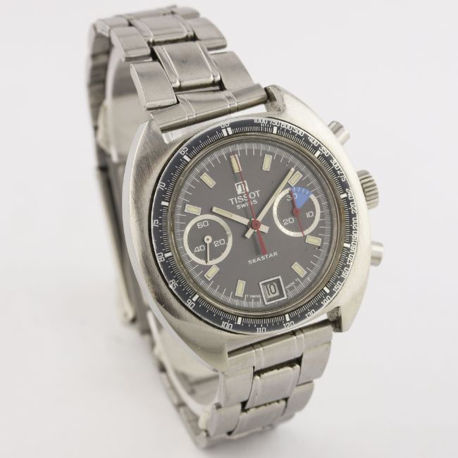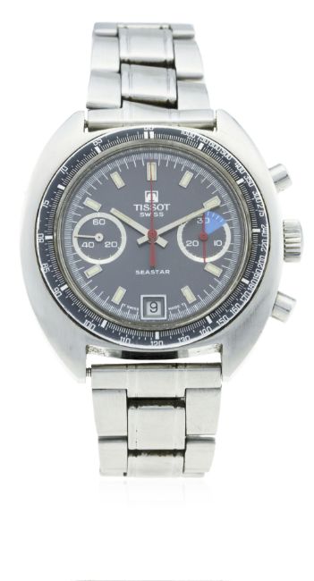 A GENTLEMAN'S STAINLESS STEEL TISSOT SEASTAR CHRONOGRAPH BRACELET WATCH DATED 1974, REF. 40522-1 WITH ORIGINAL BOX & PAPERWORK D: Grey dial with luminous inlaid silver batons & hands, double register recording minutes & continuous seconds, date aperture at 6 o'clock. M: 17 jewel manual wind movement signed Tissot & numbered, Valjoux calibre 7734. C: Tonneau shaped screw back case with black tachymetre bezel, signed Tissot & numbered, case width measures approx. 40mm. B: Original Tissot stainless steel bracelet.CONDITION REPORT D: Original dial in excellent condition. M: Working at present. C: In very good condition, with some light scratches due to general use. B: In very good condition, with some light wear due to general use. D: Dial / M: Movement / C: Case / S: Strap / B: Bracelet