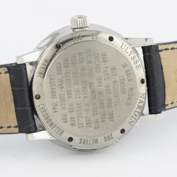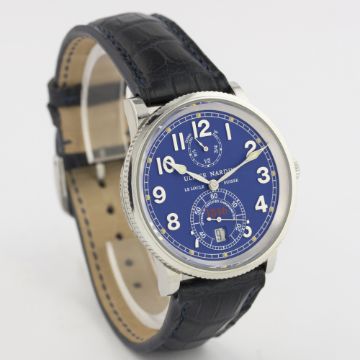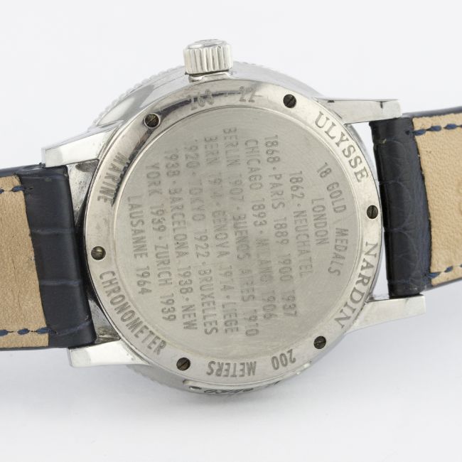 A GENTLEMAN'S STAINLESS STEEL ULYSSE NARDIN MARINE CHRONOMETER 1846 WRIST WATCH CIRCA 1990s, REF. 263-22 D: Blue dial with silver Arabic numerals, subsidiary seconds with date aperture, up & down power reserve indicator. M: Automatic chronometer movement signed Ulysse Nardin & numbered. C: Circular case, signed Ulysse Nardin Marine Chronometer & numbered, original screw down crown, case diameter measures approx. 38mm. S: Blue leather strap.CONDITION REPORT D: Original dial in excellent condition. M: Working at present. C: In excellent condition with some light scratches due to general use. S: In excellent condition. D: Dial / M: Movement / C: Case / S: Strap / B: Bracelet