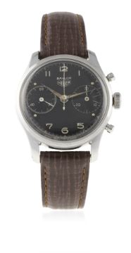 D: Black dial with silver Arabic numerals & dot markers, two large registers recording minutes & continuous seconds, dauphine hands. M: 17 jewel manual wind movement signed Ed. Heuer & Co., Valjoux calibre 23. C: Circular screw back case, signed Ed. Heuer & Co., "mini" pushers, case diameter measures approx. 34mm. S: Brown leather strap.