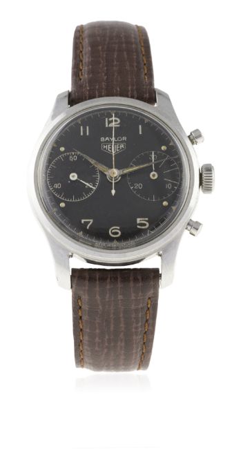 A RARE GENTLEMAN'S STAINLESS STEEL HEUER CHRONOGRAPH WRIST WATCH CIRCA 1950, RETAILED BY BAYLOR