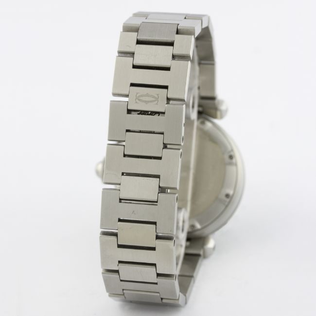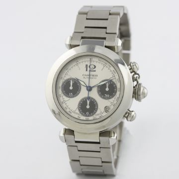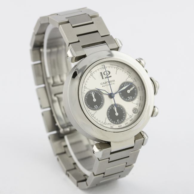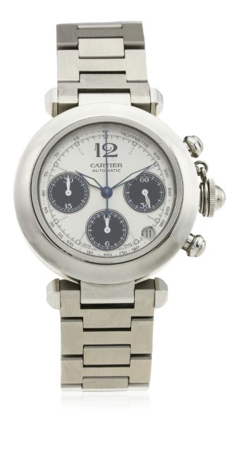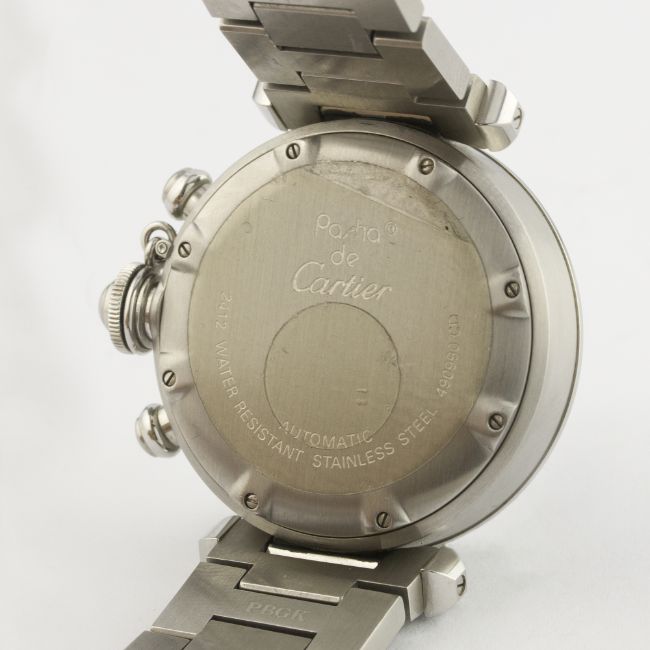 A GENTLEMAN'S STAINLESS STEEL CARTIER PASHA AUTOMATIC CHRONOGRAPH BRACELET WATCH CIRCA 2006, REF. 2412 D: Silver dial with silver batons, luminous markers & hands, three black registers recording hours, minutes & continuous seconds, date aperture, outer tachymetre scale. M: Automatic movement signed Cartier. C: Circular case with bar lugs, signed Pasha de Cartier & numbered, original crown guard & pushers, case diameter approx. 36mm. B: Original Cartier Pasha stainless steel bracelet. CONDITION REPORT D: Original dial in mint condition. M: Working at present. C: In excellent condition, with some light scratches due to general use. B: In excellent condition, with some light surface scratches. D: Dial / M: Movement / C: Case / S: Strap / B: Bracelet