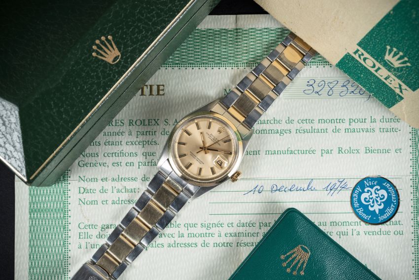 A RARE GENTLEMAN'S STEEL & GOLD ROLEX OYSTER PERPETUAL DATEJUST BRACELET WATCH DATED 1974, REF. 1600 WITH ORIGINAL BOX, PAPERS & BOOKLET D: Champagne dial with black inlaid gilt batons, date aperture. M: 26 jewel automatic chronometer movement, signed Montres Rolex S.A. & numbered, calibre 1570. C: Oyster case with solid gold smooth bezel, signed Montres Rolex S.A., numbered, Rolex crown, case diameter measures approx. 36mm. B: Original Rolex Oyster steel & solid gold bracelet, dated I.72 & numbered 7836-14/280.CONDITION REPORT D: Original dial in excellent condition. M: Working at present. C: In excellent condition. B: In very good condition, showing some light wear from general use. D: Dial / M: Movement / C: Case / S: Strap / B: Bracelet