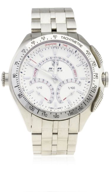 A GENTLEMAN'S STAINLESS STEEL TAG HEUER MERCEDES BENZ SLR TIMER BRACELET WATCH CIRCA 2000s, REF. CAG7011 D: Silver dial with luminous inlaid silver batons & hands, three retrograde sub-dials recording minutes, 1/10th & 1/100th of a second, inner rotating bezel recording remaining time. M: Quartz movement signed TAG Heuer, calibre S. C: Circular case with tachymetre bezel, signed TAG Heuer SLR for Mercedes Benz & numbered, original crowns & pushers, case diameter measures approx. 47mm. S: Original TAG Heuer stainless steel bracelet.CONDITION REPORT D: Original dial in mint condition. M: Working at present. C: In excellent condition. B: In excellent condition. D: Dial / M: Movement / C: Case / S: Strap / B: Bracelet