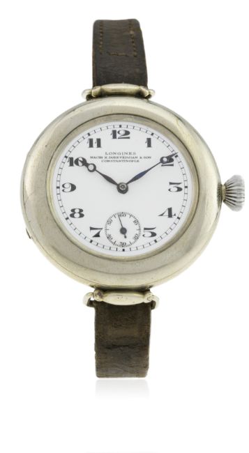 A RARE GENTLEMAN'S LARGE NICKEL CASED LONGINES WRIST WATCH CIRCA 1915, RETAILED BY NACIB K.DJEZVEDJIAN & SON, CONSTANTINOPLE D: White enamel dial with Arabic numerals & outer minute track, subsidiary seconds, blue steel Breguet hands. M: Manual wind movement signed Longines & numbered, calibre 15.26. C: Large circular case with swivel lugs, signed Longines & numbered (matching movement number), inner cuvette with matching numbers, case diameter measures approx. 41mm. S: Brown leather strap.CONDITION REPORT D: Original dial in excellent condition with no damage. M: Working at present. C: In excellent condition, with some light scratches due to occasional use. S: In fair condition. D: Dial / M: Movement / C: Case / S: Strap / B: Bracelet
