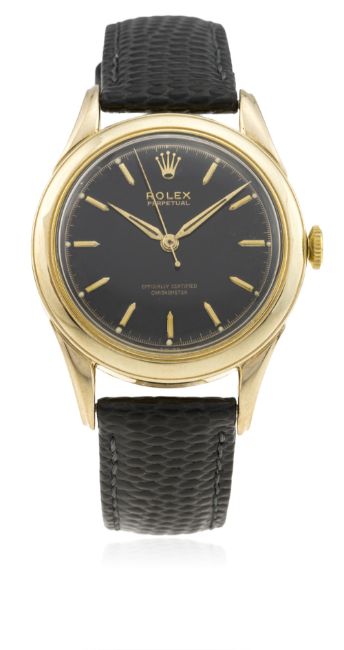 A GENTLEMAN'S 9CT SOLID GOLD ROLEX PERPETUAL WRIST WATCH CIRCA 1950 D: Black dial with gilt "pencil" batons & "dagger" hands. M: Automatic "semi bubble back" movement, signed Rolex Perpetual & numbered. C: Circular case, signed DS&S, 9ct hallmarks, case diameter measures approx. 35mm. S: Black leather strap. CONDITION REPORT D: Dial in excellent condition. M: Working at present. C: In excellent condition. S: New. D: Dial / M: Movement / C: Case / S: Strap / B: Bracelet
