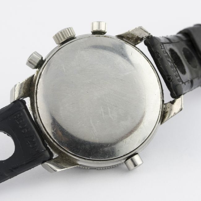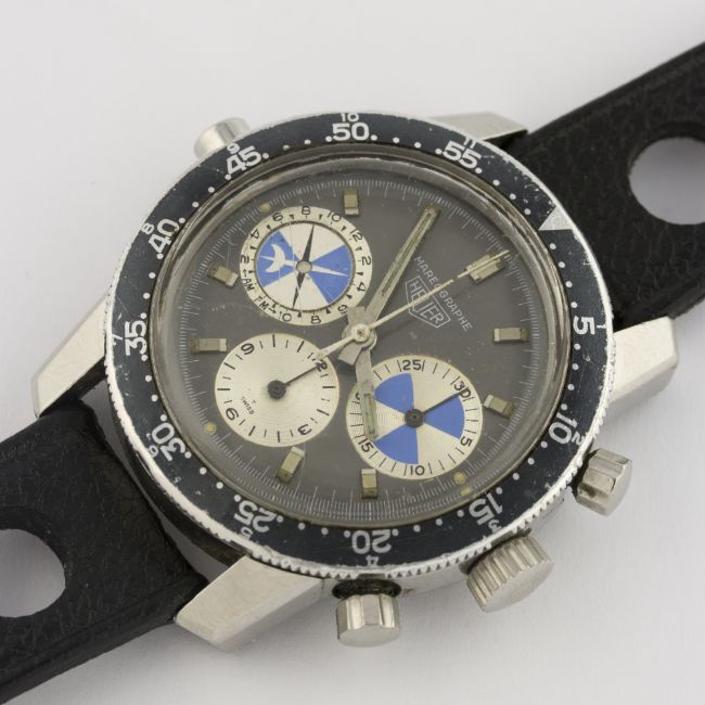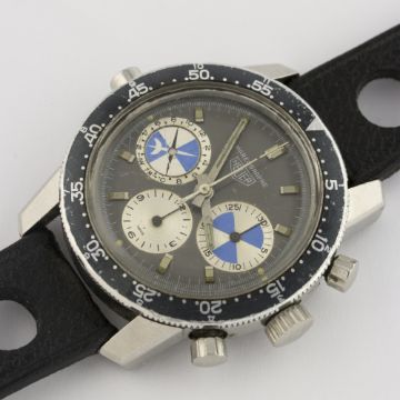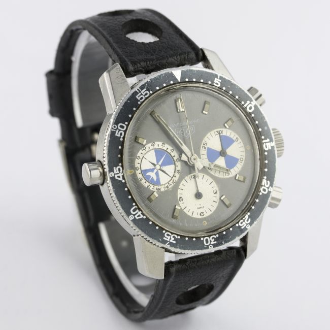 AN EXTREMELY RARE GENTLEMAN'S STAINLESS STEEL HEUER MAREOGRAPHE TIDAL CHRONOGRAPH WRIST WATCH CIRCA 1960s, REF. 2446 SF D: Grey dial with silver faceted batons, three metallic silver registers recording hours, minutes and high/low tide. M: 17 jewel manual wind movement, signed Heuer-Leonidas, calibre 721. C: Circular compressor type case with rotating MH bezel, signed Heuer-Leonidas, numbered, original crown & pushers, left hand pusher advances tidal indicator, case diameter measures approx. 40mm. S: Black rubber strap. CONDITION REPORT D: Original dial in very good condition, showing some small signs of age. M: Working at present. C: In very good condition, with some small scratches due to general use. S: In excellent condition. D: Dial / M: Movement / C: Case / S: Strap / B: Bracelet
