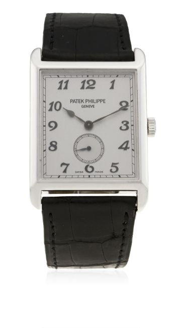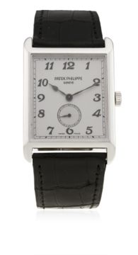 A GENTLEMAN'S LARGE SIZE 18K SOLID WHITE GOLD PATEK PHILIPPE GONDOLO WRIST WATCH CIRCA 2006, REF. 5109G D: Silver dial with Breguet numerals, subsidiary seconds. M: Manual wind movement, signed Patek Philippe & numbered. C: Large rectangular case, signed Patek Philippe, hallmarked & numbered, original crown, case measures approx. 43mm by 30mm. S: Original Patek Philippe leather strap & 18k white gold pin buckle.CONDITION REPORT D: Original dial in mint condition. M: Working at present. C: In excellent condition, with some light scratches due to general use. S: In good condition. D: Dial / M: Movement / C: Case / S: Strap / B: Bracelet