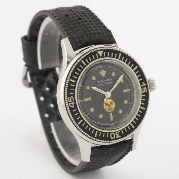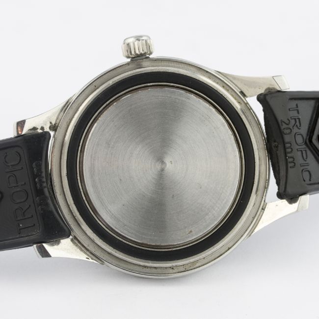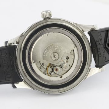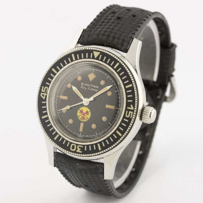 AN EXTREMELY RARE GENTLEMAN'S STAINLESS STEEL BLANCPAIN FIFTY FATHOMS DIVERS WRIST WATCH CIRCA 1960s D: Black dial with luminous markers & original hands, No Radiations symbol, outer tracking. M: 17 jewel automatic movement signed Blancpain Rayville S.A., calibre R.310. C: Circular case with 60 minute rotating bezel, two part case back signed Blancpain & numbered, original crown, dust cover, case diameter measures approx. 41mm. S: Black Tropic rubber strap. CONDITION REPORT D: Original dial in excellent condition, luminous showing a nice patina. M: Working at present. C: In excellent condition, with some light scratches due to general use. S: In excellent condition. D: Dial / M: Movement / C: Case / S: Strap / B: Bracelet